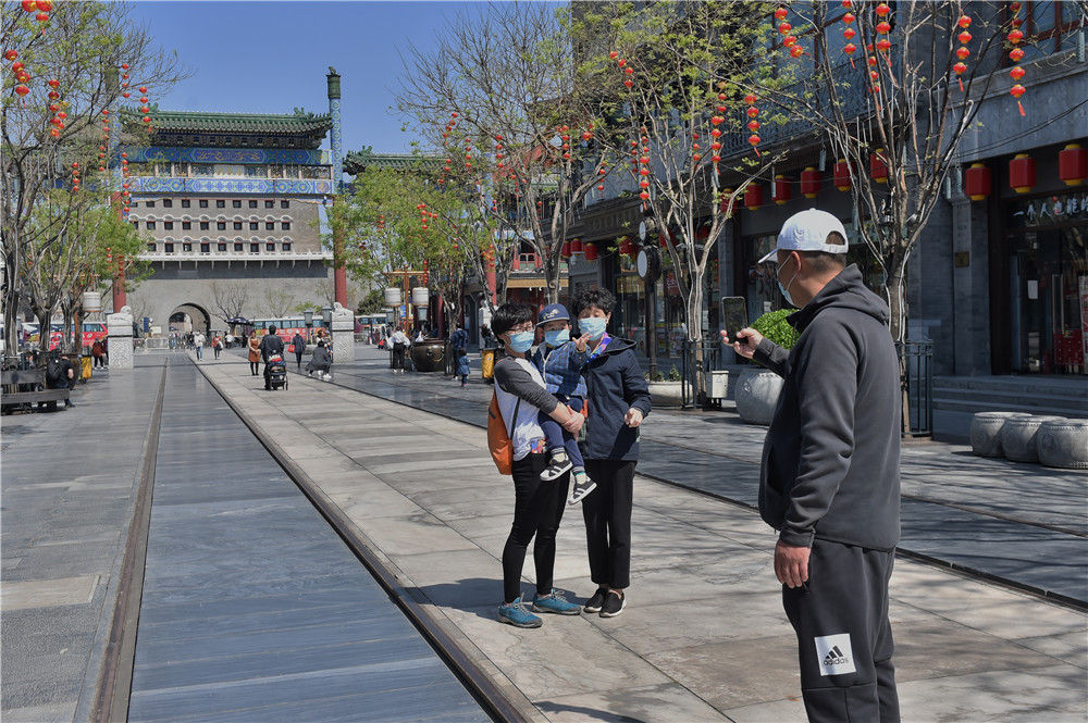 市民在北京前門(mén)大街拍照留念(2020年4月12日攝)。新華社記者 彭子洋 攝