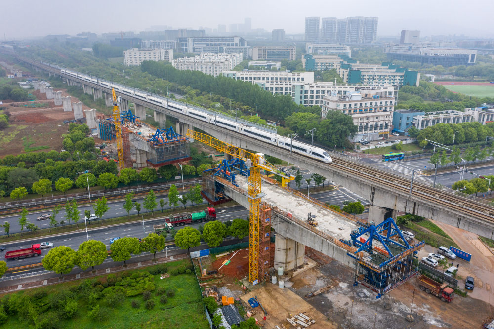 中鐵四局四公司的工程人員在江蘇南沿江城際鐵路站前Ⅰ標工程跨天元東路連續(xù)梁施工點施工作業(yè)(2021年4月27日攝,無人機照片)。新華社記者 李博 攝