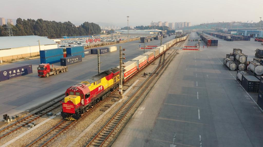 中老鐵路國際貨物列車從中鐵聯(lián)集昆明中心站駛出。(新華社發(fā))