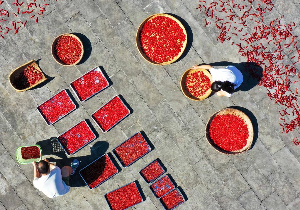 村民在銅仁市玉屏縣亞魚鄉(xiāng)亞魚村晾曬辣椒。新華社發(fā)(胡攀學 攝)