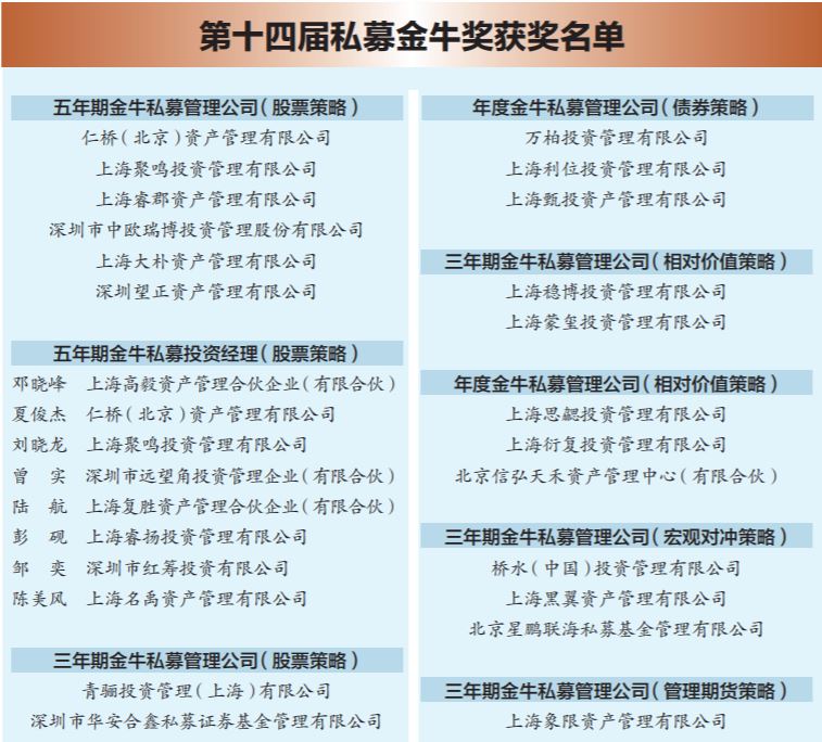 9月27日,由中國證券報(bào)主辦、國信證券獨(dú)家冠名的“國信證券杯·第十四屆私募金牛獎(jiǎng)評(píng)選”榜單揭曉,共15個(gè)獎(jiǎng)項(xiàng)、57個(gè)獲獎(jiǎng)名額出爐。