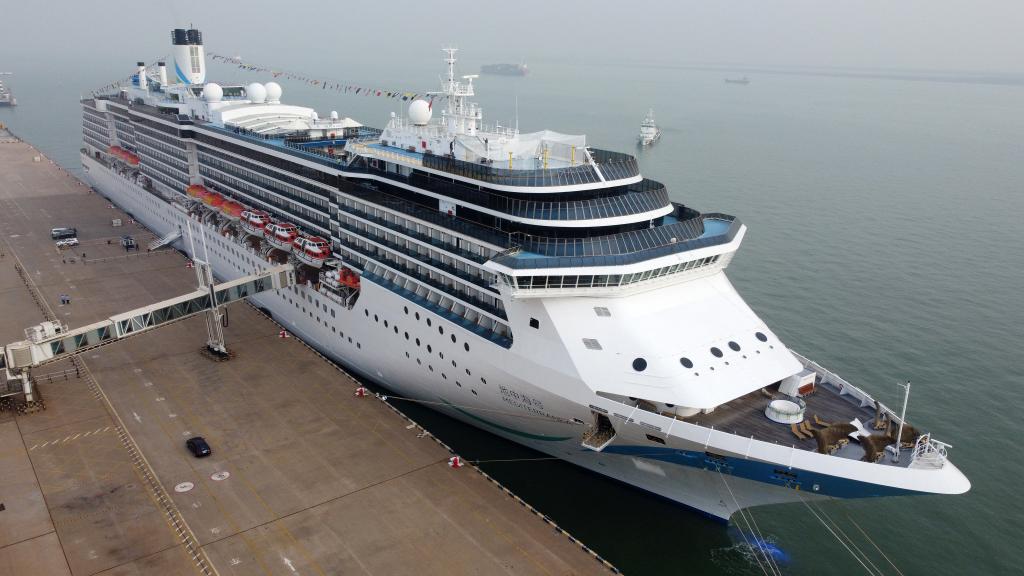 9月27日,愛達郵輪“地中!碧栢]輪靠泊在天津國際郵輪母港(無人機照片)。新華社記者 趙子碩 攝