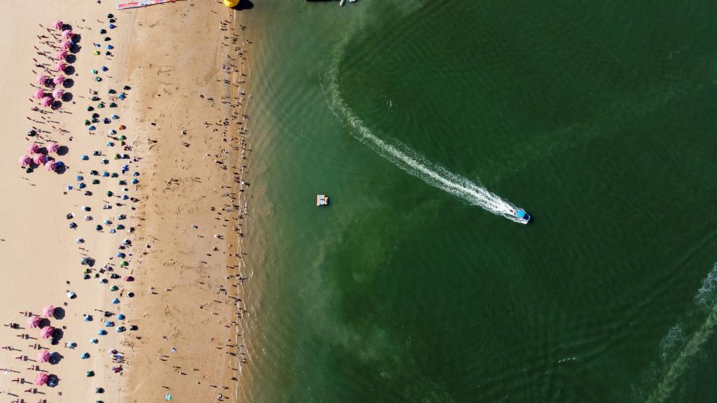 游客在天津市濱海新區(qū)東疆港人工沙灘游玩(無人機照片)。新華社記者 趙子碩 攝