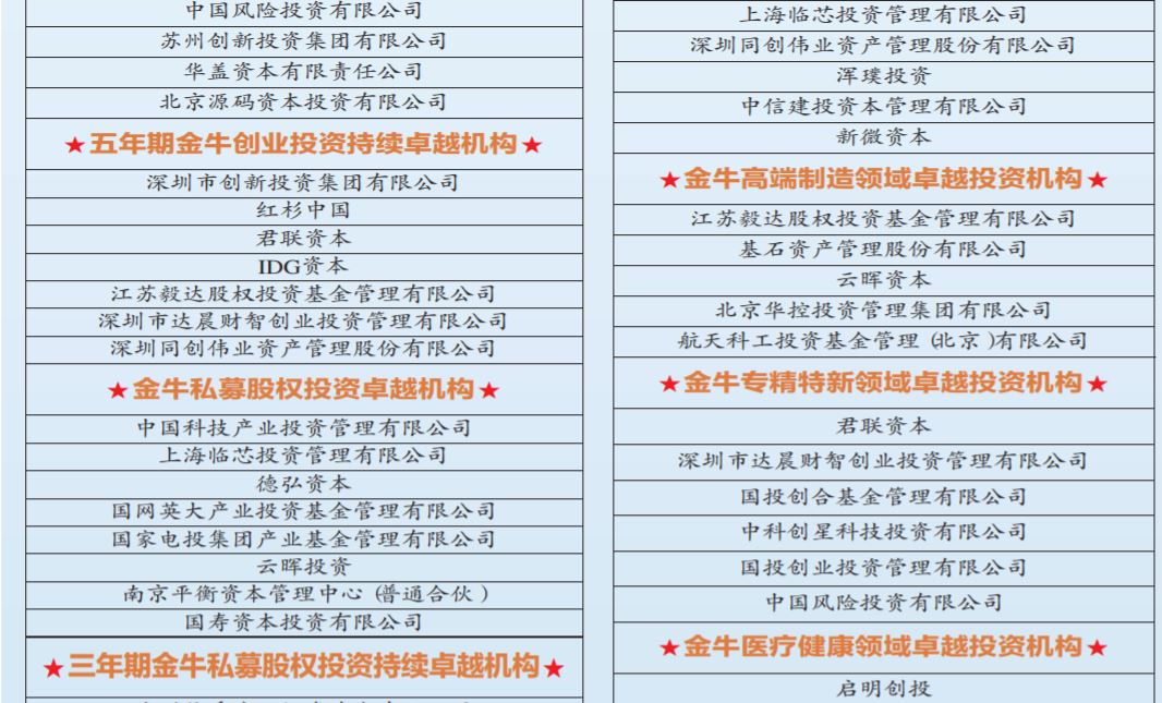 本屆評選持續(xù)突出創(chuàng)新資本戰(zhàn)略作用,大力促進(jìn)支持科技創(chuàng)新。科技領(lǐng)域繼續(xù)設(shè)立“金牛專精特新卓越投資機(jī)構(gòu)”獎項(xiàng),君聯(lián)資本、達(dá)晨財(cái)智、國投創(chuàng)合、中科創(chuàng)星等機(jī)構(gòu)獲得該項(xiàng)稱號。