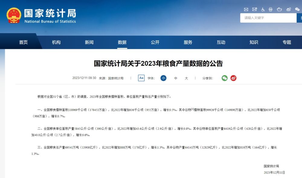 國(guó)家統(tǒng)計(jì)局關(guān)于2023年糧食產(chǎn)量數(shù)據(jù)的公告