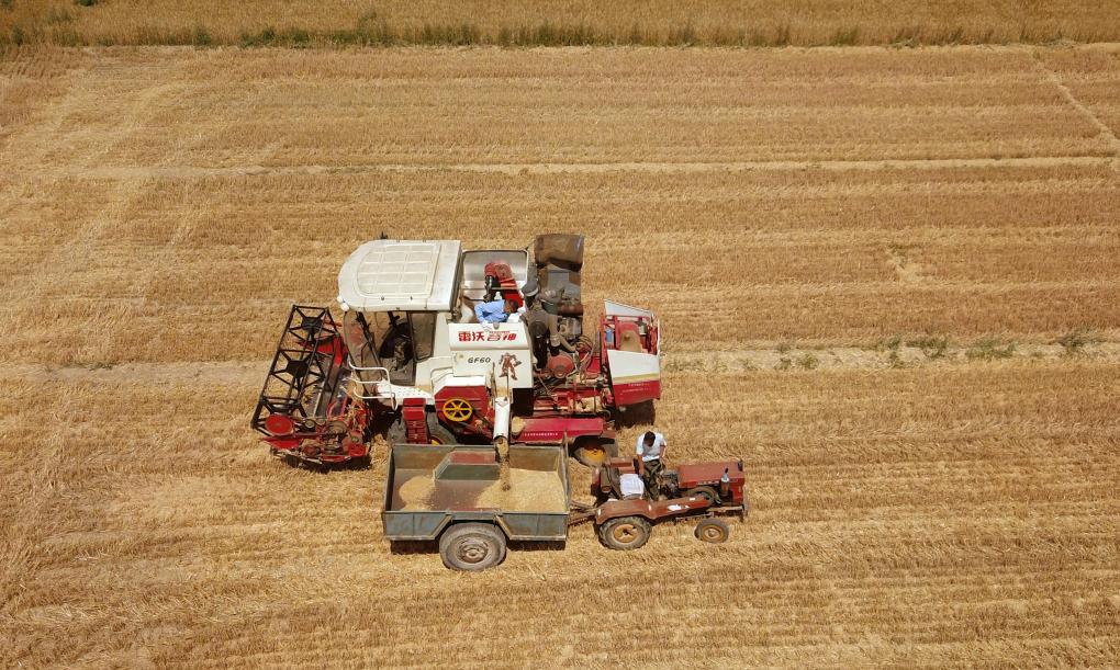 2023年6月14日,在山東省臨邑縣林子鎮(zhèn),聯(lián)合收割機(jī)在收獲小麥(無人機(jī)照片)。(新華社記者 徐速繪 攝)