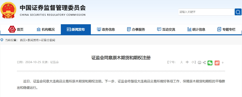 證監(jiān)會10月25日宣布,近日同意大連商品交易所原木期貨和期權(quán)注冊。