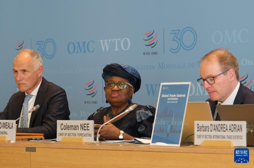 ??10月7日,在瑞士日內(nèi)瓦世界貿(mào)易組織總部,世貿(mào)組織總干事伊維拉(中)在新聞發(fā)布會上講話。新華社記者 馬汝軒 攝