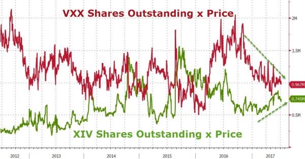 當前做空VIX期貨指數(shù)的交易規(guī)模已經(jīng)激增,而調(diào)整后的該指數(shù)期貨產(chǎn)品價格則無會休止地下降。趨勢是非常明確的——請忘記對沖,忘記恐懼,趕緊賣出VIX指數(shù)產(chǎn)品吧。