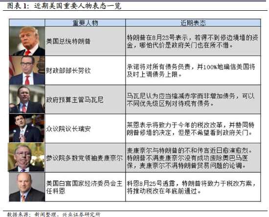 第一階段:美國債務(wù)上限+政府關(guān)門風險再次來襲。隨著支出法案的到期和美國新財年的臨近,債務(wù)上限和新預(yù)算決議再一次成為懸在美國政府和國會頭上的達摩克利斯之劍。美國政府官員各持己見,博弈氛圍仍濃。8 月23 日,美國總統(tǒng)特朗普明確表示如果沒有建設(shè)邊境墻的撥款就讓政府在10 月份關(guān)門,此番言論讓市場嘩然。