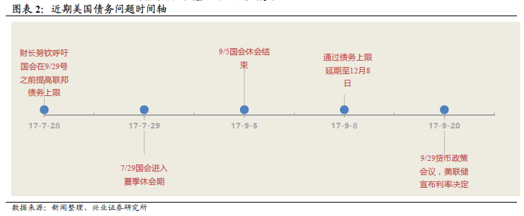 9 月8 日,美國國會參議院以80-17 票投票批準哈維颶風援助計劃,并將債務(wù)上限延長至12 月8 日。盡管短期內(nèi)債務(wù)上限危機得以緩解,但共和黨人對此項決議并不滿意,預(yù)計債務(wù)上限可能捆綁減稅法案,仍將持續(xù)發(fā)酵。興業(yè)證券發(fā)表最新研報,試圖理清美國債務(wù)上限和預(yù)算決議機制,剖析各方矛盾焦點,回顧歷史上的危機以及資本市場表現(xiàn)。