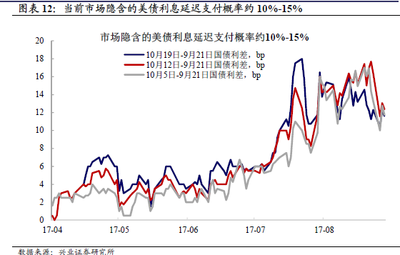 7 月以來,10 月到期與9 月到期的美國短期國債利差快速上升,暗示市場擔憂美國國債利息延遲支付的概率約為10%-15%,近期擔憂明顯回落。
