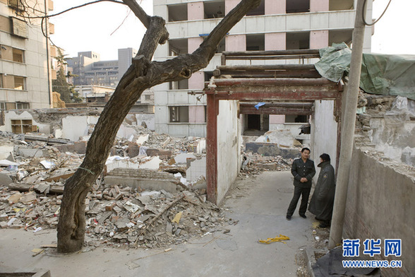 資料圖片:1月27日,保安在梁思成、林徽因故居殘破的門樓旁聊天。新華社記者 沈伯韓 攝