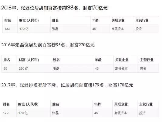 2015年,張磊位居胡潤百富榜第133名,財富170億元;2016年張磊位居胡潤百富榜95名,財富220億元;2017年,張磊排名有所下降,位居胡潤百富榜179名,財富170億元。
