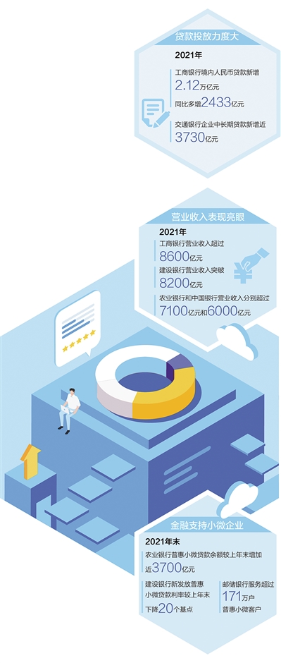 今天的信貸投放,關(guān)系著明天的經(jīng)濟發(fā)展。2021年,工行境內(nèi)人民幣貸款新增2.12萬億元;農(nóng)行新增貸款2萬億元,創(chuàng)歷史新高;建行發(fā)放貸款和墊款較上年增加1.94萬億元……大型商業(yè)銀行貸款投放力度持續(xù)加大,“頭雁”效應得到較好發(fā)揮。