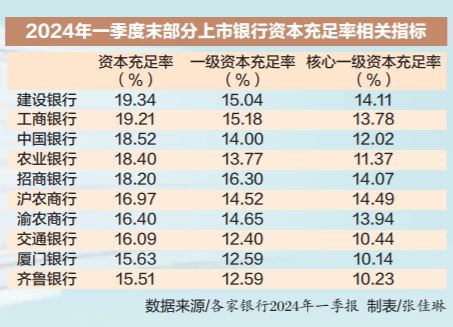 國家金融監(jiān)督管理總局數(shù)據(jù)顯示,截至2023年末,商業(yè)銀行資本充足率、一級資本充足率、核心一級資本充足率分別為15.06%、12.12%、10.54%,較2022年末分別下降0.11個、0.18個、0.2個百分點。在上市銀行披露的2023年報中也可以看出,多家銀行核心一級資本充足率同比出現(xiàn)下滑。