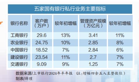 六大國有行中,除了郵儲銀行“初步實現(xiàn)私行業(yè)務破局”尚未披露相關數(shù)據(jù)外,工商銀行、農(nóng)業(yè)銀行、中國銀行、建設銀行、交通銀行五家大行私行客戶數(shù)均較年初增長超7%。其中,工商銀行、農(nóng)業(yè)銀行、建設銀行私行客戶數(shù)均較年初實現(xiàn)了兩位數(shù)增長。五家大行加總客戶數(shù)已經(jīng)突破100萬戶。管理資產(chǎn)規(guī)模方面,五家大行均在萬億元級別,較年初的增長幅度均超6%。