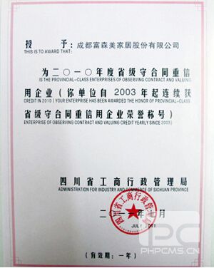 四川省工商局授予“2010年度省級守合同重信用企業(yè)”榮譽(yù)稱