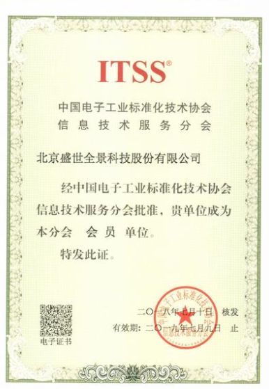 2018年07月10日,經(jīng)中國(guó)電子工業(yè)標(biāo)準(zhǔn)化技術(shù)協(xié)會(huì)信息技術(shù)服務(wù)分會(huì)審核批準(zhǔn),北京盛世全景科技股份有限公司成為了ITSS分會(huì)全權(quán)會(huì)員。