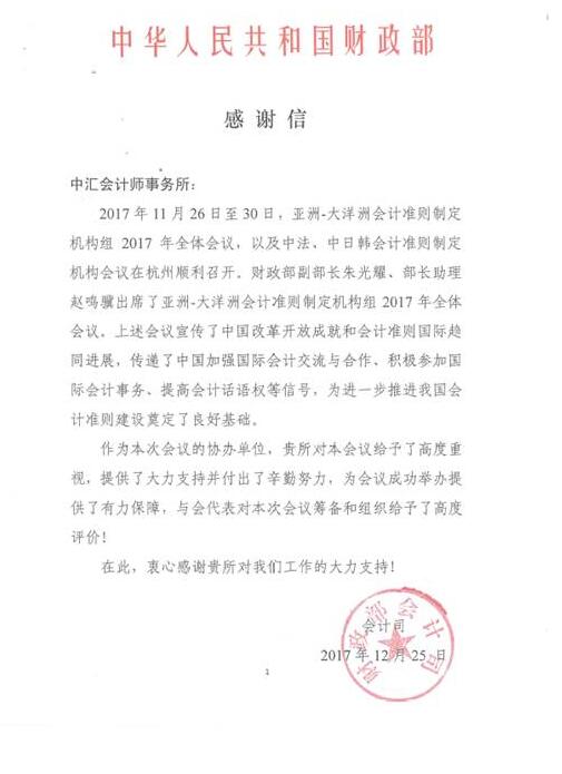 我所喜于12月25日收到財(cái)政部感謝信,感謝我所傾力協(xié)辦亞洲-大洋洲會(huì)計(jì)準(zhǔn)則制定機(jī)構(gòu)組2017年全體會(huì)議以及中法、中日韓會(huì)計(jì)準(zhǔn)則制定機(jī)構(gòu)會(huì)議。
