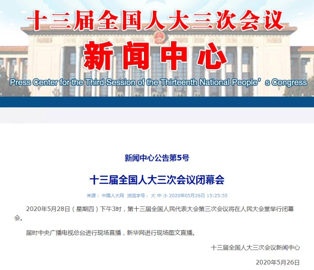 2020年5月28日(星期四)下午3時,第十三屆全國人民代表大會第三次會議將在人民大會堂舉行閉幕會。 屆時中央廣播電視總臺進行現(xiàn)場直播,新華網(wǎng)進行現(xiàn)場圖文直播。
