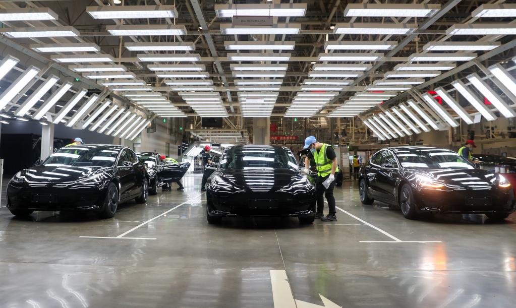 工作人員在特斯拉上海超級(jí)工廠內(nèi)作業(yè)。新華社記者 丁汀 攝