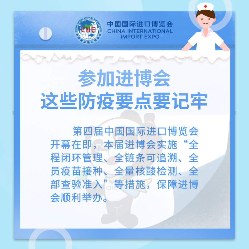 第四屆中國(guó)國(guó)際進(jìn)口博覽會(huì)開幕在即,本屆進(jìn)博會(huì)實(shí)施“全程閉環(huán)管理、全鏈條可追溯、全員疫苗接種、全量核酸檢測(cè)、全部查驗(yàn)準(zhǔn)入”等措施,保障進(jìn)博會(huì)順利舉辦。(策劃:姚玉潔 林艷興;設(shè)計(jì):沈梅 王若宇 佘靈)