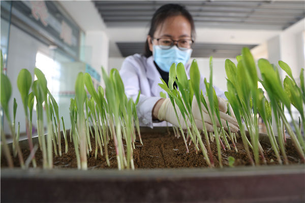 在遼寧東亞種業(yè)有限公司種子質(zhì)量檢測(cè)中心,工作人員查看玉米種子發(fā)芽實(shí)驗(yàn)結(jié)果(2020年3月16日攝)。新華社記者 楊青 攝
