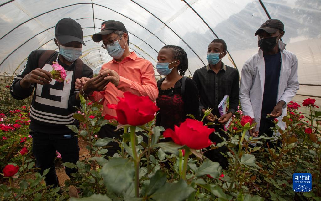 2021年6月25日,在肯尼亞納庫魯郡的埃格頓大學(xué),來自中國的農(nóng)學(xué)教授劉高瓊(左二)和學(xué)生們在溫室大棚內(nèi)討論花卉育種和病蟲害防治。新華社記者 張宇 攝