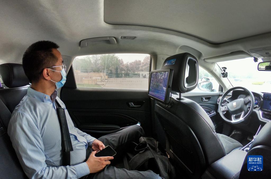 在北京經濟技術開發(fā)區(qū),一名乘客在體驗“主駕無人、副駕駛配備安全員”的無人駕駛車(2022年4月25日攝)。新華社記者 彭子洋 攝