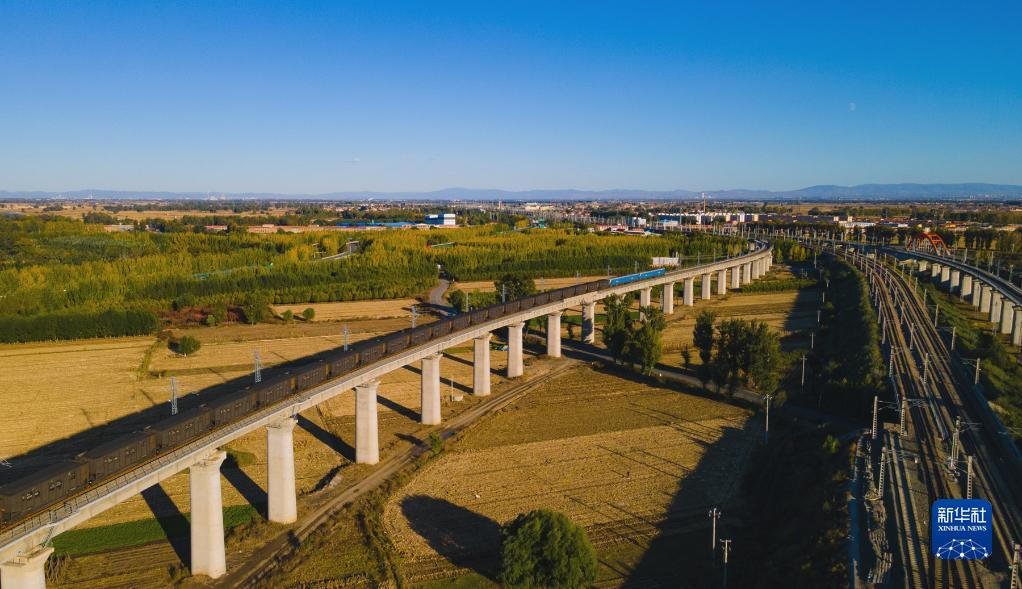 這是在內蒙古呼和浩特拍攝的運煤專列(2021年10月15日攝,無人機照片)。新華社發(fā)(夏亮 攝)