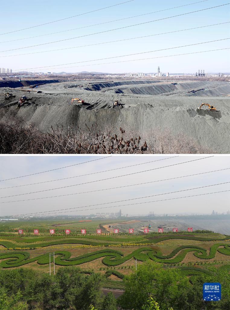 拼版照片:上圖為遼寧省撫順市西露天礦部分區(qū)域生態(tài)恢復(fù)前的場景(2019年3月6日攝,資料照片);下圖為遼寧省撫順市西露天礦部分區(qū)域生態(tài)恢復(fù)后的場景(新華社記者楊青2022年6月2日攝,無人機(jī)照片)。新華社發(fā)