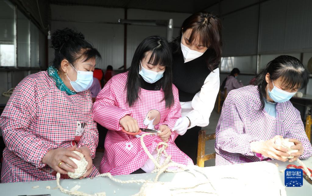 在遼寧省鞍山市臺安縣高力房鎮(zhèn)喬坨村,婦女在當(dāng)?shù)孛撠毊a(chǎn)業(yè)項(xiàng)目支持的工藝品廠里工作(2021年3月4日攝)。新華社記者 蔡湘鑫 攝
