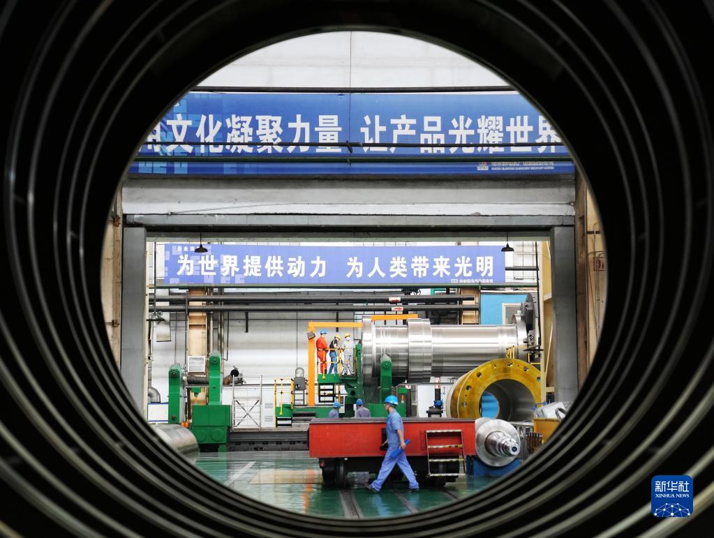 在哈電集團哈爾濱電機廠有限責任公司車間,工人進行生產(chǎn)作業(yè)(2022年6月27日攝)。新華社記者 王建威 攝