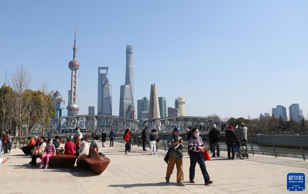 人們在上海蘇州河邊漫步休閑(2021年2月21日攝)。新華社記者 方喆 攝