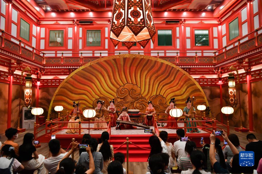 2022年7月16日,演員在西安曲江新區(qū)內(nèi)的長安十二時辰主題街區(qū)表演。新華社記者 張博文 攝