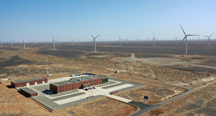 沿著河西走廊向西,一望無(wú)垠的戈壁灘上,一排排風(fēng)電機(jī)組整齊列陣、迎風(fēng)旋轉(zhuǎn),陽(yáng)光下閃爍的光伏板仿佛藍(lán)色海洋,上萬(wàn)塊定日鏡和吸熱塔組成的“超級(jí)鏡子發(fā)電站”耀眼而震撼。