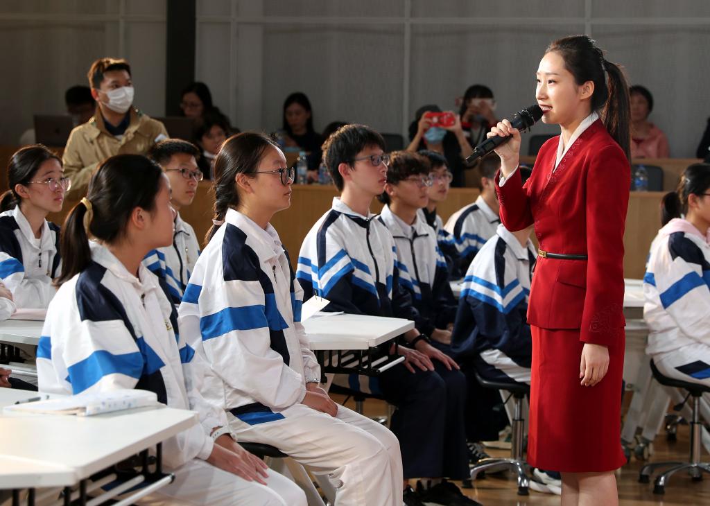 2021年10月25日,張欣怡在為上海中學(xué)的學(xué)生講述革命文物的故事。新華社記者 劉穎 攝