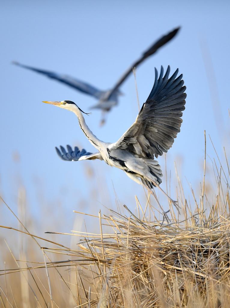 4月1日,蒼鷺在沙湖景區(qū)棲息、飛翔。新華社記者馮開華攝