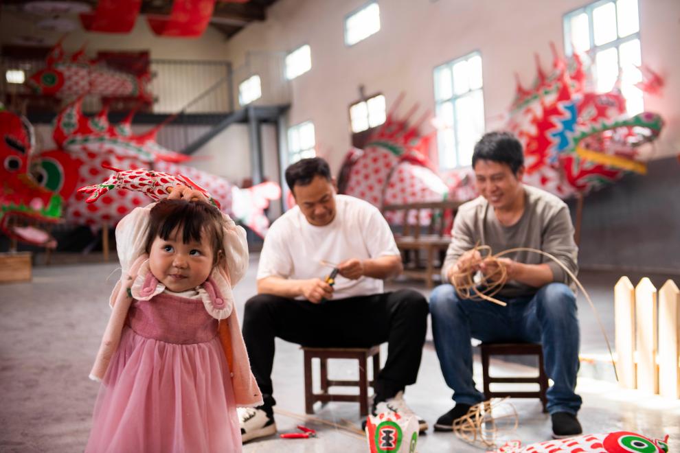 小朋友在安徽省黃山市歙縣溪頭鎮(zhèn)汪滿田村魚燈工坊內(nèi)玩耍(5月10日攝)。新華社記者 傅天 攝