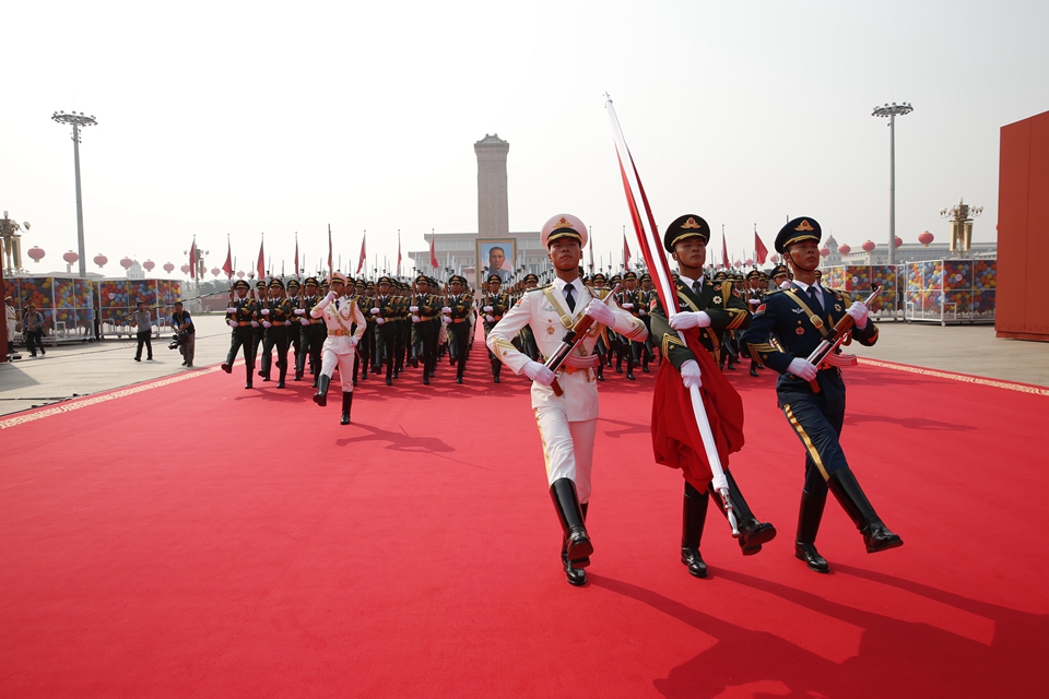 儀仗方隊(duì)首次同時(shí)高擎黨旗國旗軍旗國慶受閱