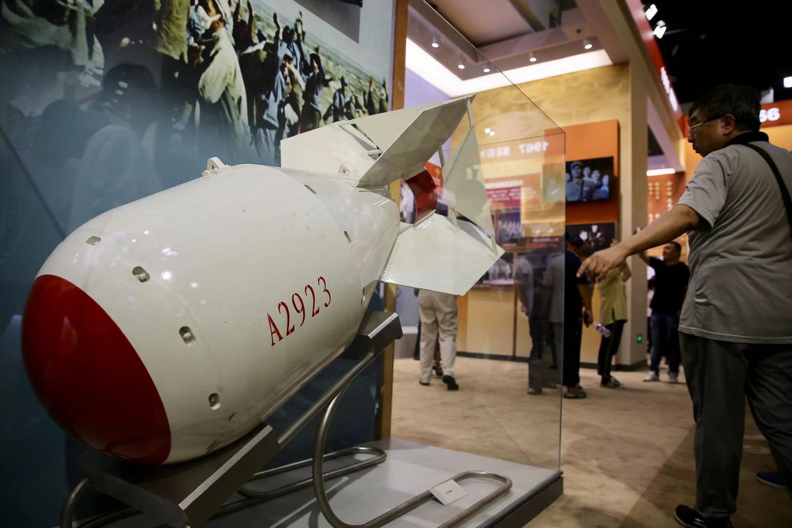 觀眾觀看第一顆原子彈模型 本報(bào)記者 車亮 攝