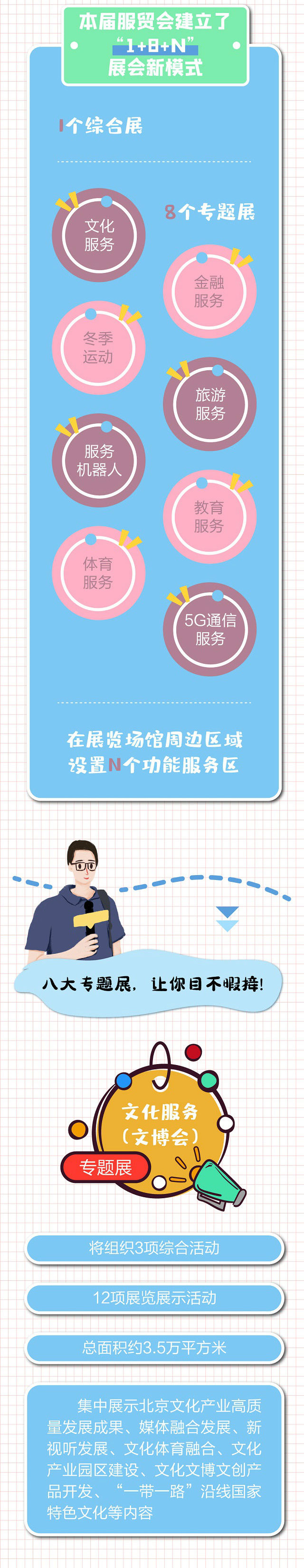本屆服貿會整合了北京文博會、旅博會、金博會、冬博會、機器人大會等重要展會和內容,建立了“1+8+N”新模式!1”是綜合展區(qū),包括序廳、公共衛(wèi)生防疫專區(qū)、國別和省區(qū)市專區(qū)及服務貿易十二大領域企業(yè)專區(qū),集中展示國內外服務貿易發(fā)展最新趨勢、最新技術、最新產品,以及中國解決方案等;“8”是八個行業(yè)專題展,文化服務、金融服務、冬季運動、旅游服務、服務機器人、教育服務、體育服務、5G通信服務等專題展將集中亮相服貿會;“N”是因地制宜設置若干功能服務區(qū),為參展客商提供洽談、體驗、餐飲等配套服務。
