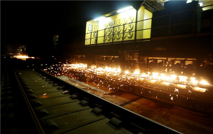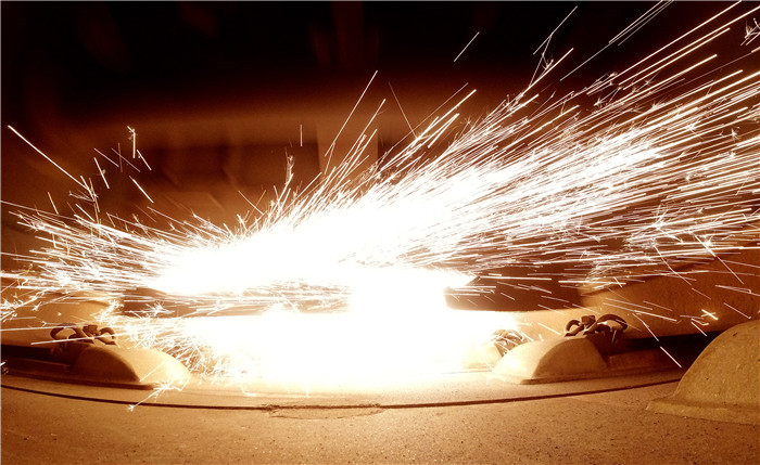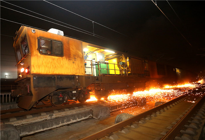 ↑1月9日,正在進行鋼軌打磨作業(yè)的打磨車下火花四濺。 新華社記者 方喆 攝