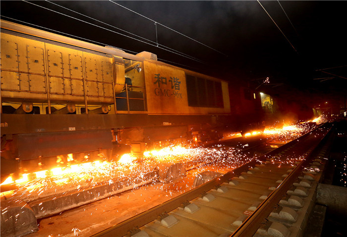 在午夜至黎明的高速列車停運時間,中國鐵路上海局集團有限公司上海大型養(yǎng)路機械運用檢修段的職工駕駛鋼軌打磨車,爭分奪秒對規(guī)定線路的鋼軌進行“整形打磨”。由5節(jié)作業(yè)車組成的鋼軌打磨車全長114米,裝備96個打磨電機,可將鋼軌縱向1000毫米范圍內(nèi)的高度差控制在0.2毫米以內(nèi),使鋼軌更加平順。這些被稱為“火花俠”的鋼軌打磨員工,通過每日“黑白顛倒”的辛勤勞作,保障乘客旅途安全、平穩(wěn)。