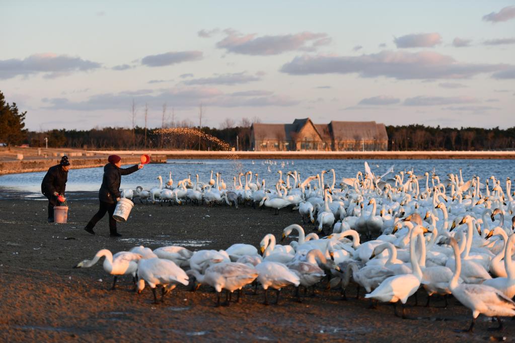 “開飯啦”,趙淑珍將一勺勺金黃的玉米粒撒向天空,在地面落成美麗的弧線。劉志斌吹響哨子,一群群天鵝聚攏而來,發(fā)出陣陣召喚“飯友”的鳴叫。老兩口坐在倒扣的玉米桶上,笑吟吟地看著。